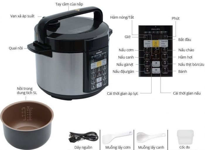 Van áp suất tự động điều chỉnh: Nồi áp suất Philips được thiết kế hệ thống van áp suất tự động điều chỉnh, do vậy ban dễ dàng lựa chọn chế độ nấu phù hợp theo từng món ăn và cực kì an toàn cho người sử dụng