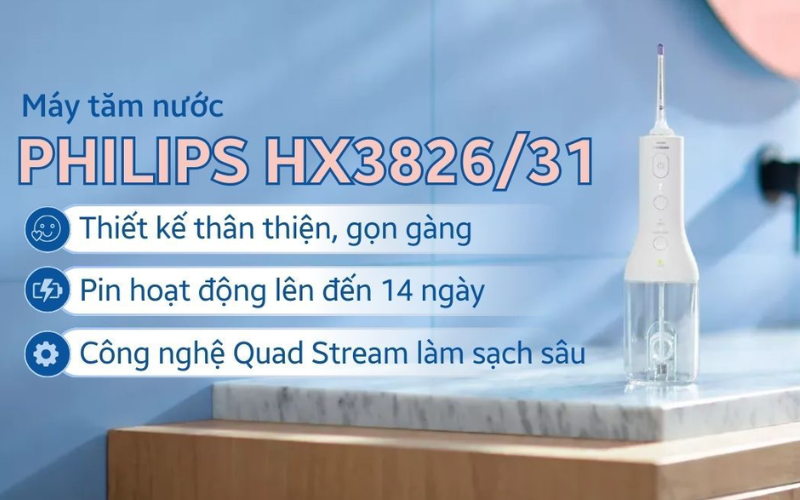 Máy tăm nước cầm tay Philips làm sạch răng với công nghệ Quad Stream HX3826/31