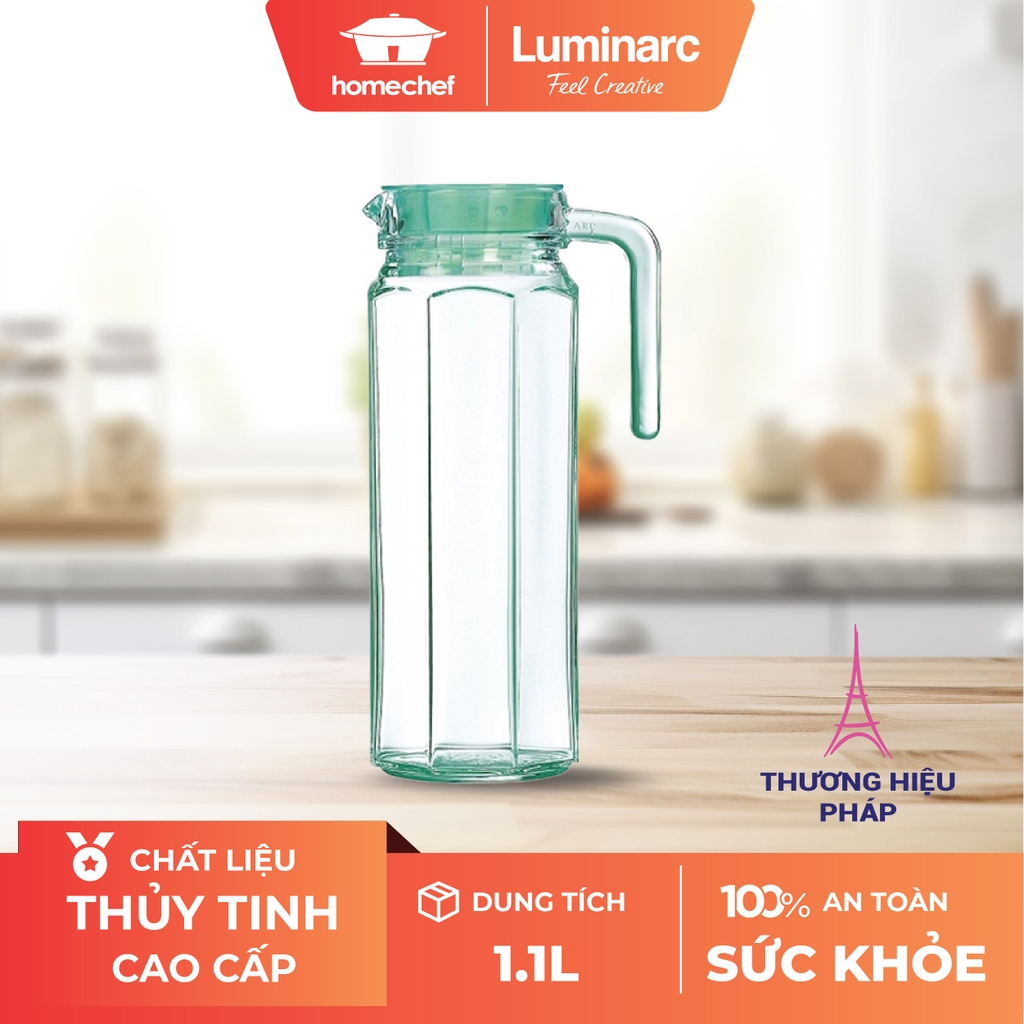 Bình thủy tinh Luminarc màu xanh 1.1L d ung tích 1.3l mang đến sự tiện dụng, đồng thời góp phần tô điểm vẻ hiện đại cho không gian bàn nước mỗi gia đình.
