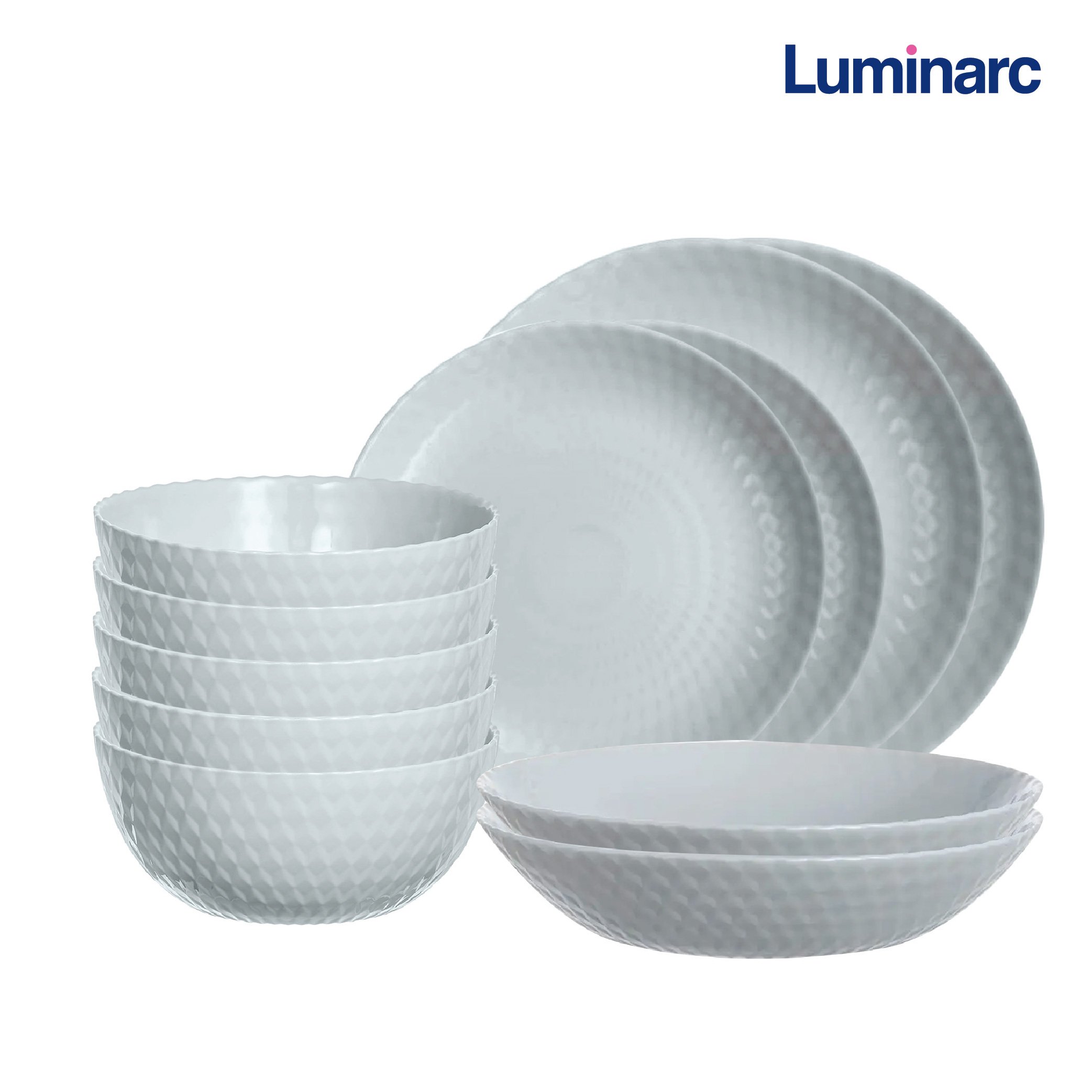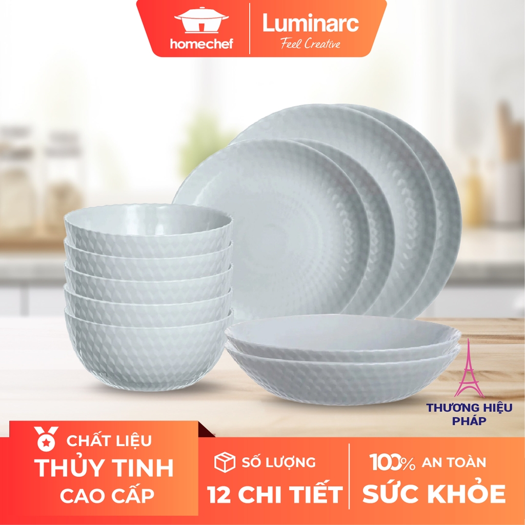 Bộ gồm: 6 bát ăn cơm 13cm, 2 đĩa sâu lòng 20cm, 2 đĩa nông 19cm, 2 đĩa nông 25cm.