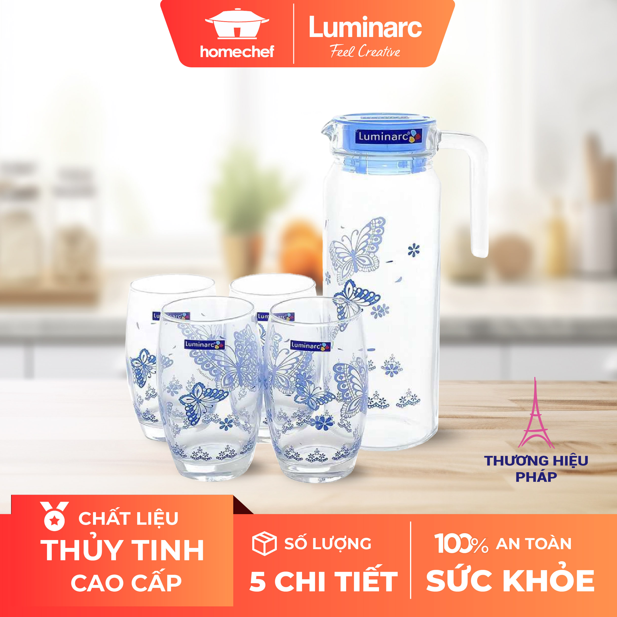 Bộ bình ly gồm: 1 bình nước dung tích 1.1 lít với tay cầm chắc chắn, thoải mái, người dùng không bị trượt tay, 4 ly thủy tinh dung tích 350 ml thiết kế dạng bầu tròn vừa tay, đem lại sự thoải mái khi sử dụng.