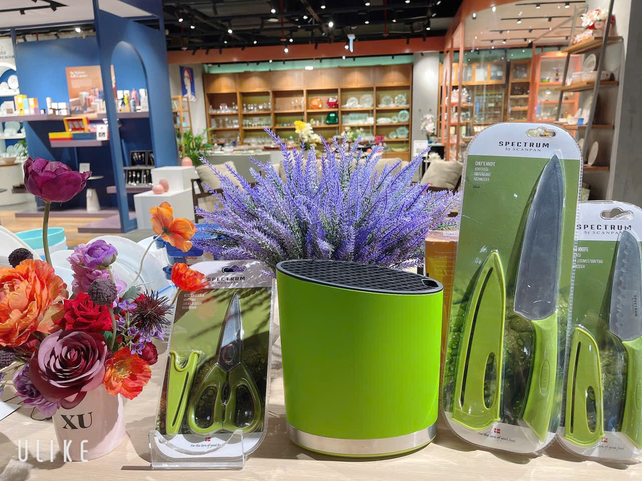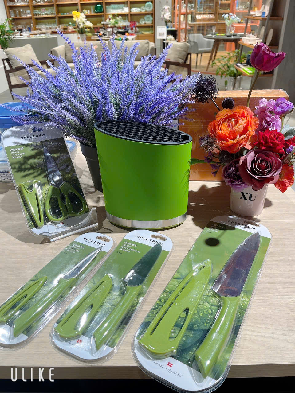 Màu xanh lá chủ đạo của bộ dao Spectrum tạo nên vẻ đẹp tinh tế, phù hợp với nhiều phong cách bếp hiện đại. Ống cắm dao đi kèm giúp sắp xếp gọn gàng, an toàn và tiết kiệm diện tích. Ngoài ra còn có nắp bảo vệ lưỡi dao đi kèm giúp đảm bảo an toàn khi sử dụng.