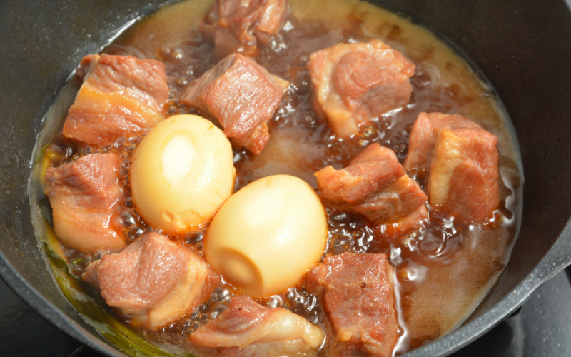 Ướp thịt ba chỉ với nước mắm, đường, tỏi hành, rồi cho vào nồi áp suất cùng trứng luộc và nước dừa tươi. Nấu 15 phút là thịt mềm rục, thấm vị, trứng lên màu đẹp mắt, nước kho sóng sánh. Món ăn đậm đà, ăn với cơm trắng rất đưa miệng. So với kho bằng nồi thường, nồi áp suất giúp thịt mềm nhanh, nước kho ngọt và dậy mùi thơm hơn.