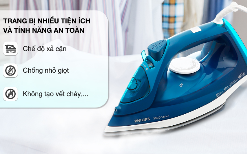Bàn ủi còn có tự động ngắt điện, điều chỉnh nhiệt độ linh hoạt theo từng loại vải, mang lại sự an toàn và tiện lợi tối đa. Bàn ủi còn có tính năng tự động ngắt điện, đảm bảo an toàn tối đa: ngắt sau 8 phút khi đặt dựng đứng và 30 giây khi đặt nằm ngang không chuyển động, giúp tránh tình trạng cháy vải. Chức năng xả cặn tích hợp giúp loại bỏ cặn bám trong lỗ thoát hơi nước, duy trì hiệu suất cao nhất và kéo dài tuổi thọ bàn ủi, đồng thời cho phép sử dụng với nước máy thông thường mà không lo hư hỏng.