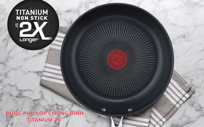 Tefal Duetto Plus G7320434 được phủ lớp chống dính Titanium 2x giúp hạn chế tối đa tình trạng bám dính thực phẩm, ngay cả khi chế biến với lượng dầu rất ít. Lớp phủ này chịu nhiệt tốt đến 250°C, không sinh ra chất độc hại, an toàn cho sức khỏe của cả gia đình. Ngoài ra, bề mặt chống dính còn hỗ trợ việc vệ sinh nhanh chóng, có thể rửa bằng máy rửa bát mà không lo bong tróc, tiết kiệm thời gian và công sức.