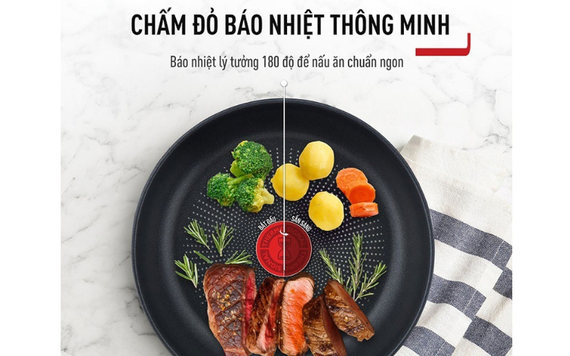 Ở giữa lòng chảo có điểm báo nhiệt thông minh. Khi nhiệt độ đạt mức lý tưởng, dấu hiệu này sẽ chuyển sang màu đậm hơn, giúp người dùng dễ dàng nhận biết và điều chỉnh lửa phù hợp. Nhờ đó, các món ăn được nấu chín đều, giữ trọn hương vị thơm ngon.