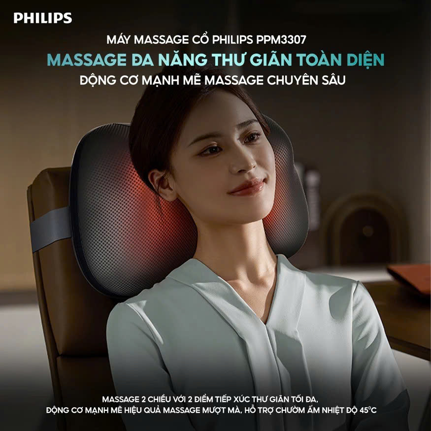 Một trong những điểm nổi bật của Philips PPM3307 là khả năng massage đa chiều nhờ hệ thống hai đầu xoa bóp gồm một bi lớn và một bi nhỏ, tạo lực mô phỏng động tác ngón tay. Cụm massage tự động đổi chiều kết hợp cùng chườm ấm ở mức nhiệt khoảng 45 độ, giúp cơ được thư giãn, giảm đau mỏi và thúc đẩy tuần hoàn máu tốt hơn. Thiết bị thích hợp sử dụng cho nhiều vùng trên cơ thể như cổ, vai, lưng, eo, bắp chân và đùi.