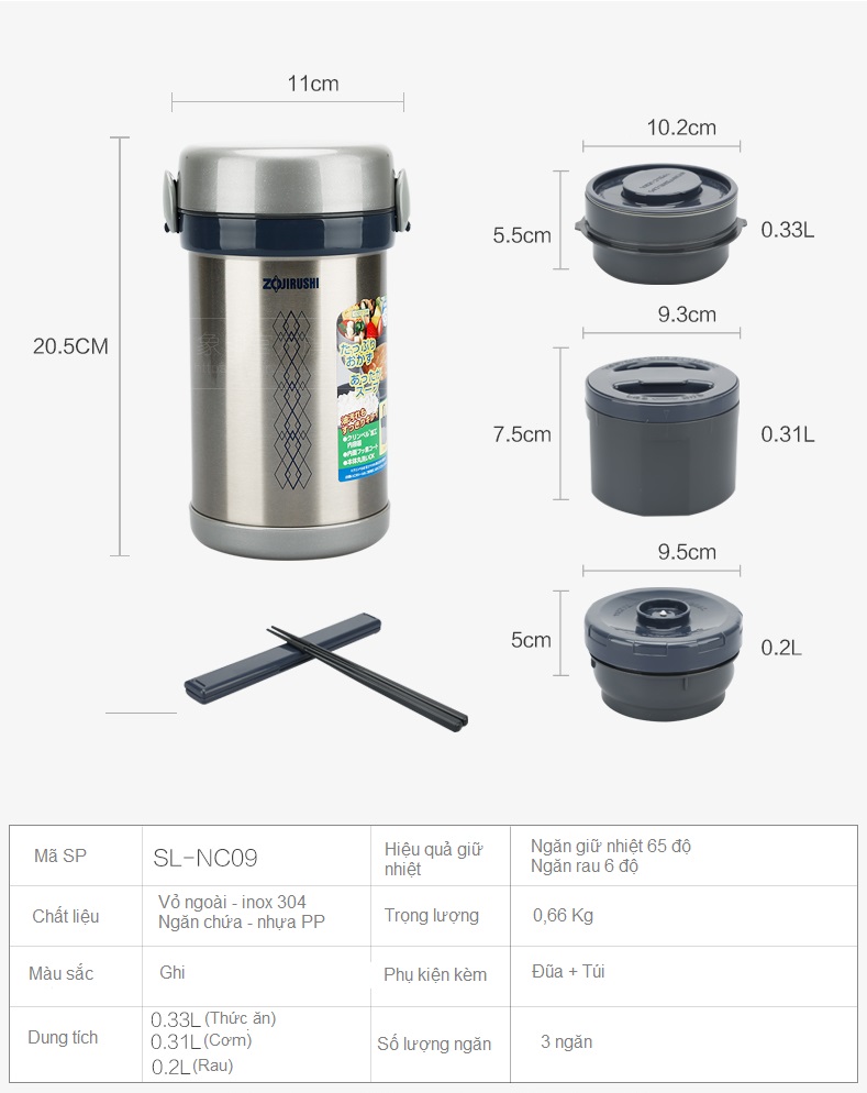Được trang bị 3 hộp nhỏ riêng biệt với 3 kích thước lớn nhỏ khác nhau giúp bạn linh hoạt trong việc đựng thức ăn phù hợp, kèm theo là bộ đũa và túi xách, hộp đựng cơm Zojirushi SL-JAF14-SA phù hợp đựng cơm và thức ăn mang đi học, đi làm hay đi dã ngoại...