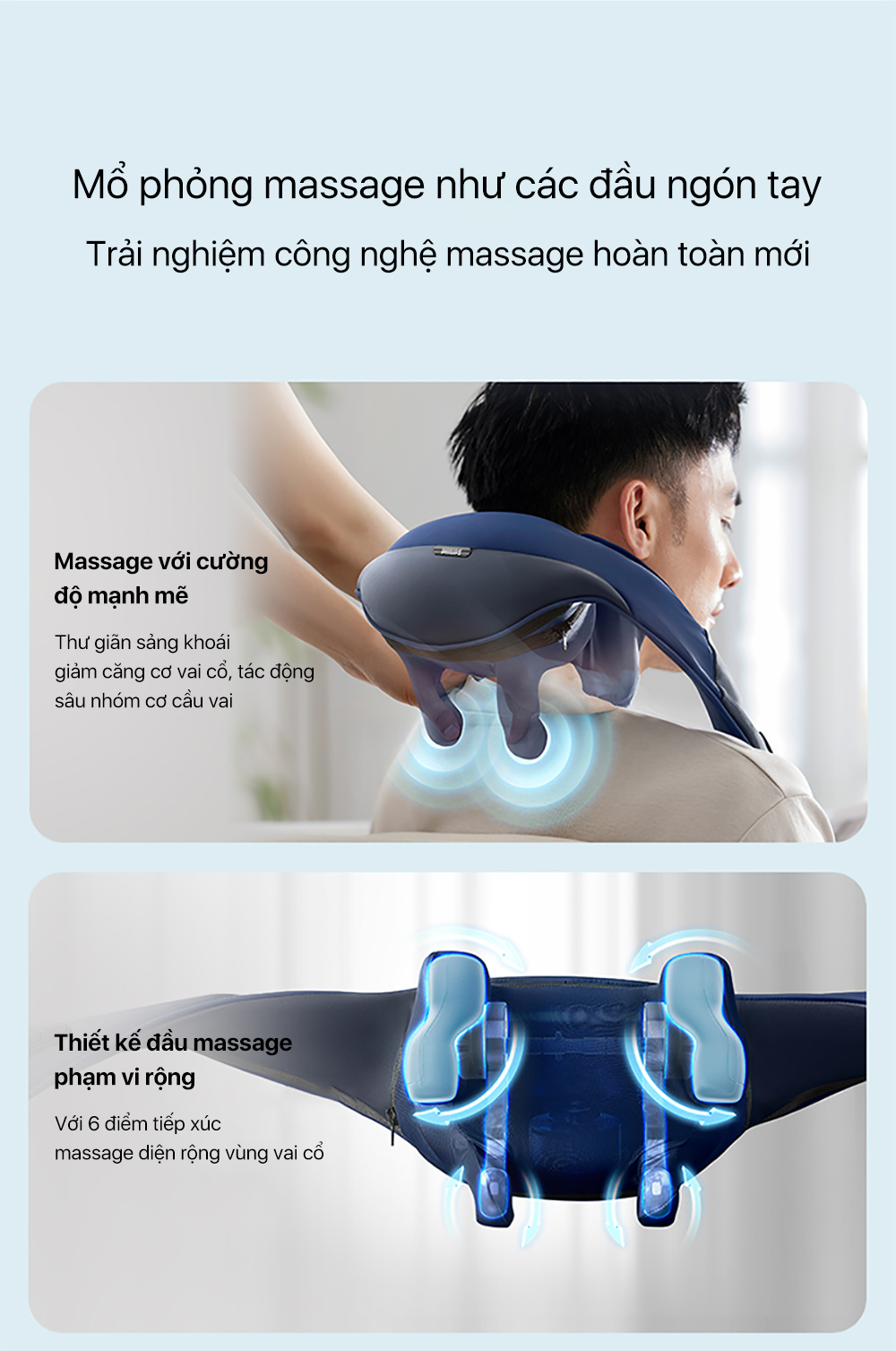 Chất liệu vải kháng khuẩn kết hợp da PU cao cấp mang lại cảm giác êm ái, dễ vệ sinh và bền đẹp theo thời gian. Sáu đầu massage 3D làm từ nhựa ABS và silicone được đặt nghiêng 45 độ, giúp ôm khít vùng cổ vai, tăng hiệu quả tác động sâu.