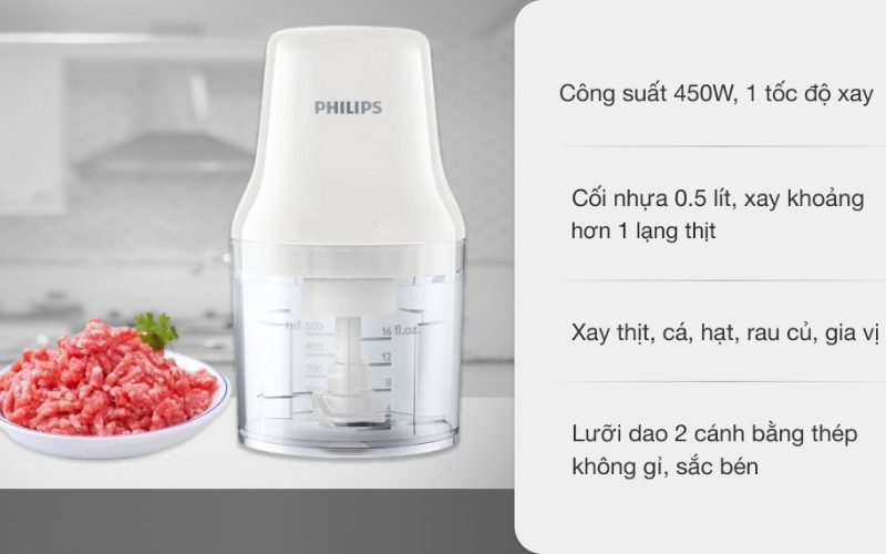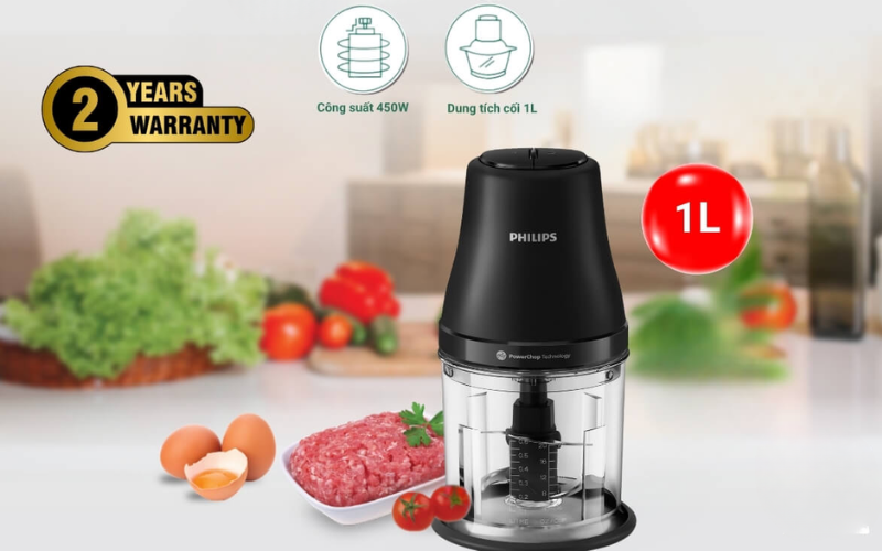Máy xay thịt Philips HR1501/00 sở hữu công suất mạnh mẽ 450W, kết hợp công nghệ PowerChop giúp tối ưu hiệu suất xay nhờ thiết kế lưỡi dao, góc cắt và cấu trúc cối thông minh, xử lý mượt mà cả nguyên liệu mềm lẫn cứng mà không lo vón cục hay kẹt dao. Máy được trang bị 4 lưỡi dao thép không gỉ sắc bén, cối nhựa dung tích 1 lít an toàn cho sức khỏe, phù hợp để xay thịt, rau củ, gia vị, làm sốt hay nước chấm cho bữa ăn gia đình. Với 2 mức tốc độ linh hoạt, người dùng dễ dàng điều chỉnh độ thô – mịn theo nhu cầu, cùng đế cao su chống trượt giúp máy vận hành ổn định, an toàn. Các bộ phận có thể tháo rời và rửa bằng máy rửa chén, mang lại sự tiện lợi tối đa trong quá trình sử dụng và vệ sinh hằng ngày.
