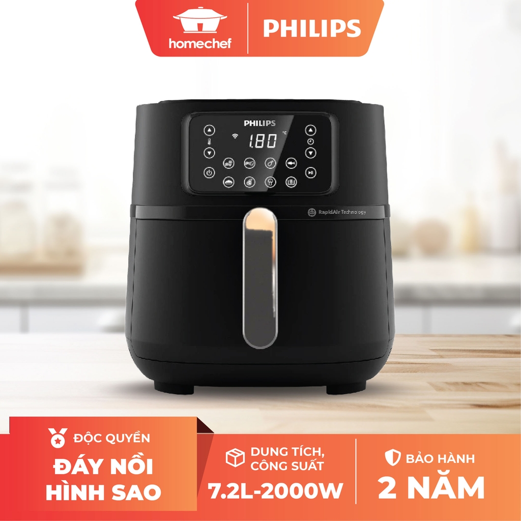 Philips Airfryer 5000 Series XXL Connected sử dụng không khí nóng để chiên món ăn giòn rụm với lượng chất béo giảm đến 90%**