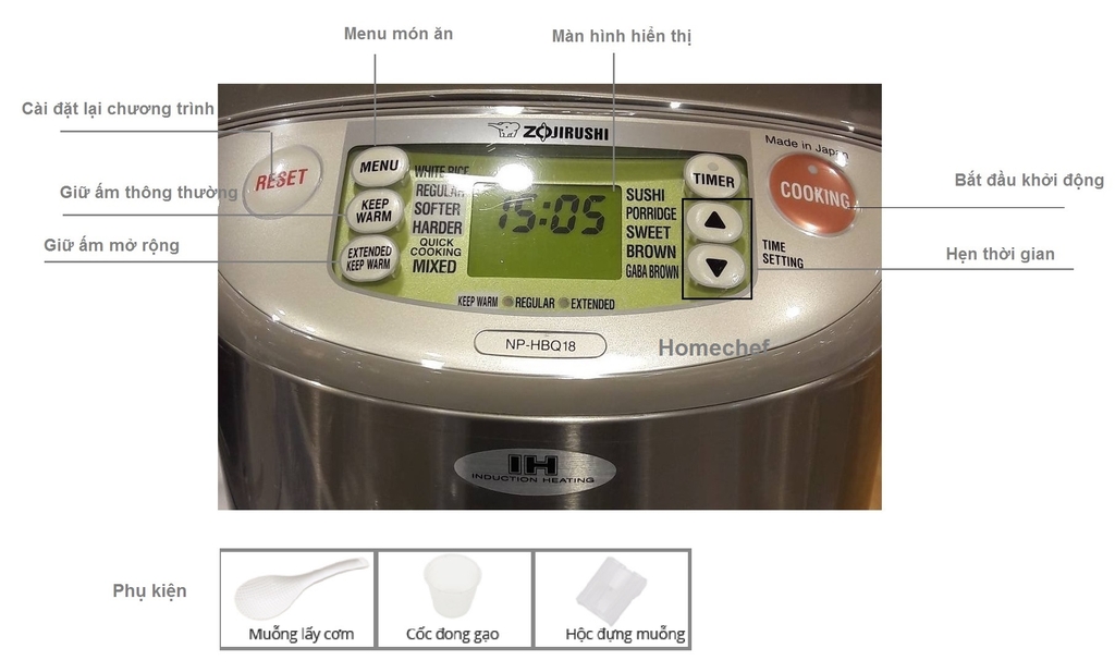 - Menu nấu phong phú: Gạo trắng hạt thường/dài/ngắn, Nấu nhanh, Cơm trộn, Cơm sushi, Cháo, Xôi, Gạo lứt, Gạo lứt nảy mầm