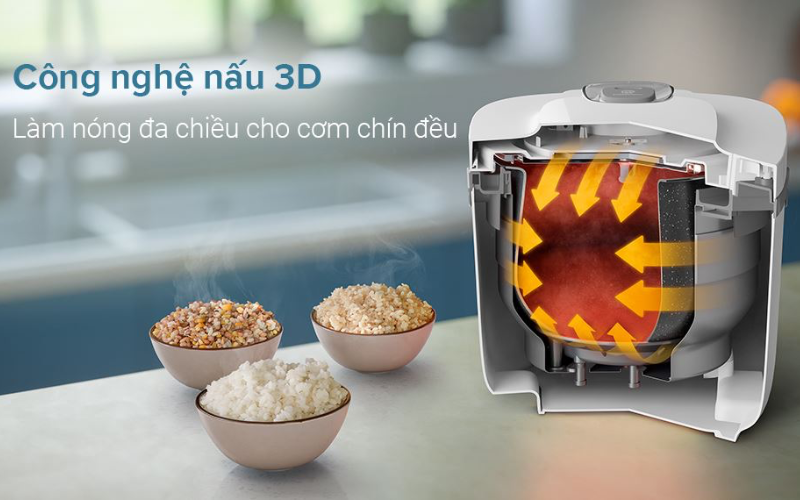 Nồi cơm được làm nóng đồng thời từ trên xuống dưới và từ hai bên hông, kết hợp với chip nấu thông minh kiểm soát chính xác hơi nóng và nhiệt độ. Điều này đảm bảo cơm chín đều, tơi xốp và thơm ngon, đồng thời giúp giảm nguy cơ cơm bị khê hoặc chín không đều.