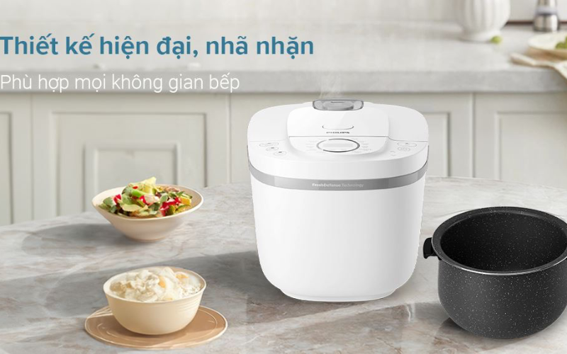 Nồi cơm điện tử Philips HD4717/30 dung tích 1,8 lít, công suất 860 W là giải pháp nấu ăn tiện lợi cho cả gia đình. Sản phẩm được trang bị công nghệ FreshDefense cải tiến, giúp duy trì độ ẩm bổ sung thông qua kiểm soát nhiệt độ và luân chuyển không khí, hạn chế sự phát triển của vi khuẩn trong tối đa 48 giờ, giữ cơm luôn tươi ngon và an toàn. Nồi còn có 12 menu nấu được tối ưu và chức năng giữ ấm lên đến 48 giờ, giúp bạn dễ dàng chế biến đa dạng món ăn từ cơm thường, cháo đến các món hấp cho bé, đảm bảo bữa cơm thơm ngon và đầy dinh dưỡng. Hãy cùng Homechef tìm hiểu chi tiết dưới đây nhé!