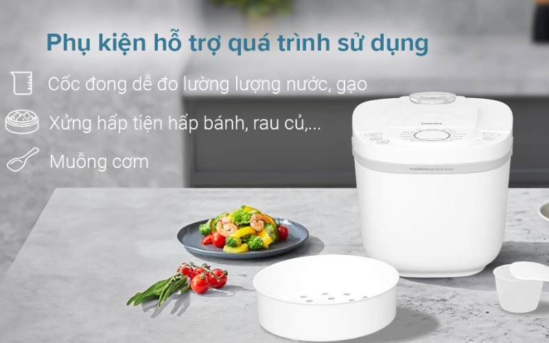 Với dung tích 1,8 lít, nồi có khả năng nấu đủ cơm cho tối đa 10 người. Thiết kế điều khiển bằng nút bấm đơn giản, dễ sử dụng kết hợp với chất liệu an toàn, không chứa PFOA, BFR và PVC, đã được các cơ quan quốc tế chứng nhận, mang lại sự an tâm tuyệt đối khi sử dụng.