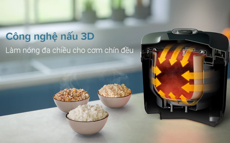 Nồi áp dụng công nghệ nấu 3D (làm nóng từ 3 hướng: dưới đáy, xung quanh và trên nắp) cùng chip nấu thông minh, có khả năng kiểm soát chính xác hơi nóng và nhiệt độ, đảm bảo cơm chín đều, thơm ngon và giữ trọn dưỡng chất.
