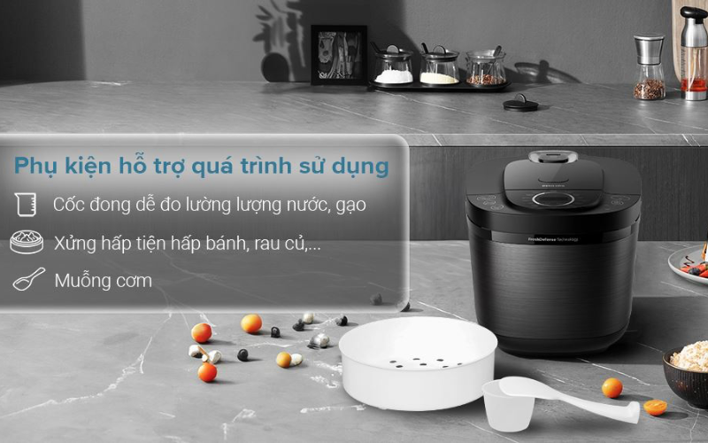 Sản phẩm đi kèm xửng hấp tiện lợi cho việc chế biến các món hấp, cùng với cốc đong và muỗng cơm, hoàn thiện trải nghiệm sử dụng.