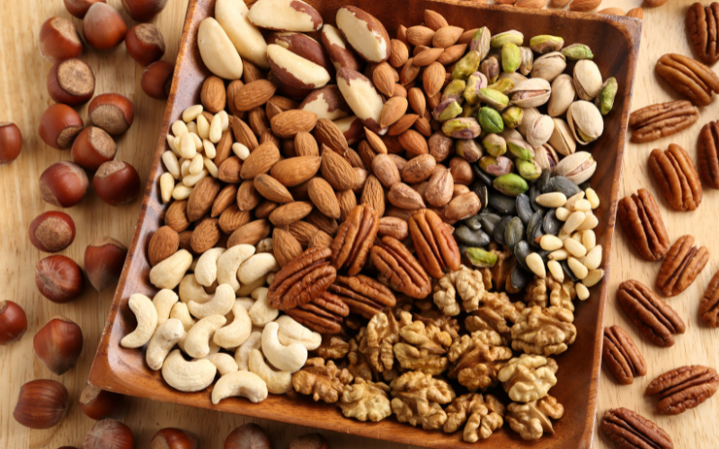 Trong những ngày Tết, thay vì liên tục ăn bánh kẹo ngọt, bạn có thể chọn các loại hạt như hạnh nhân, hạt điều, macca… để giảm cảm giác thèm ăn. Những loại hạt này giàu chất xơ, protein và vitamin, giúp tạo cảm giác no lâu, hạn chế ăn vặt quá nhiều.