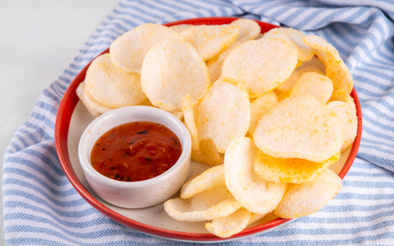 Snack khoai tây giòn tan là món ăn vặt dễ làm mà cực “cuốn”. Khoai tây thái lát mỏng, ngâm nước cho bớt tinh bột rồi chiên ở 200°C trong 10 phút là có thể thưởng thức ngay. Bạn có thể rắc thêm muối, tiêu hoặc bột ớt để tạo vị riêng cho món snack này.
