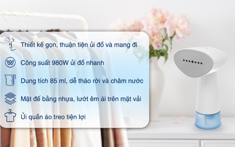 - Nhỏ gọn, dễ dàng mang theo: Với kích thước nhỏ và trọng lượng nhẹ, bàn là hơi nước cầm tay là người bạn đồng hành lý tưởng trong những chuyến du lịch hoặc công tác. Bạn có thể dễ dàng bỏ vào vali mà không tốn nhiều diện tích.